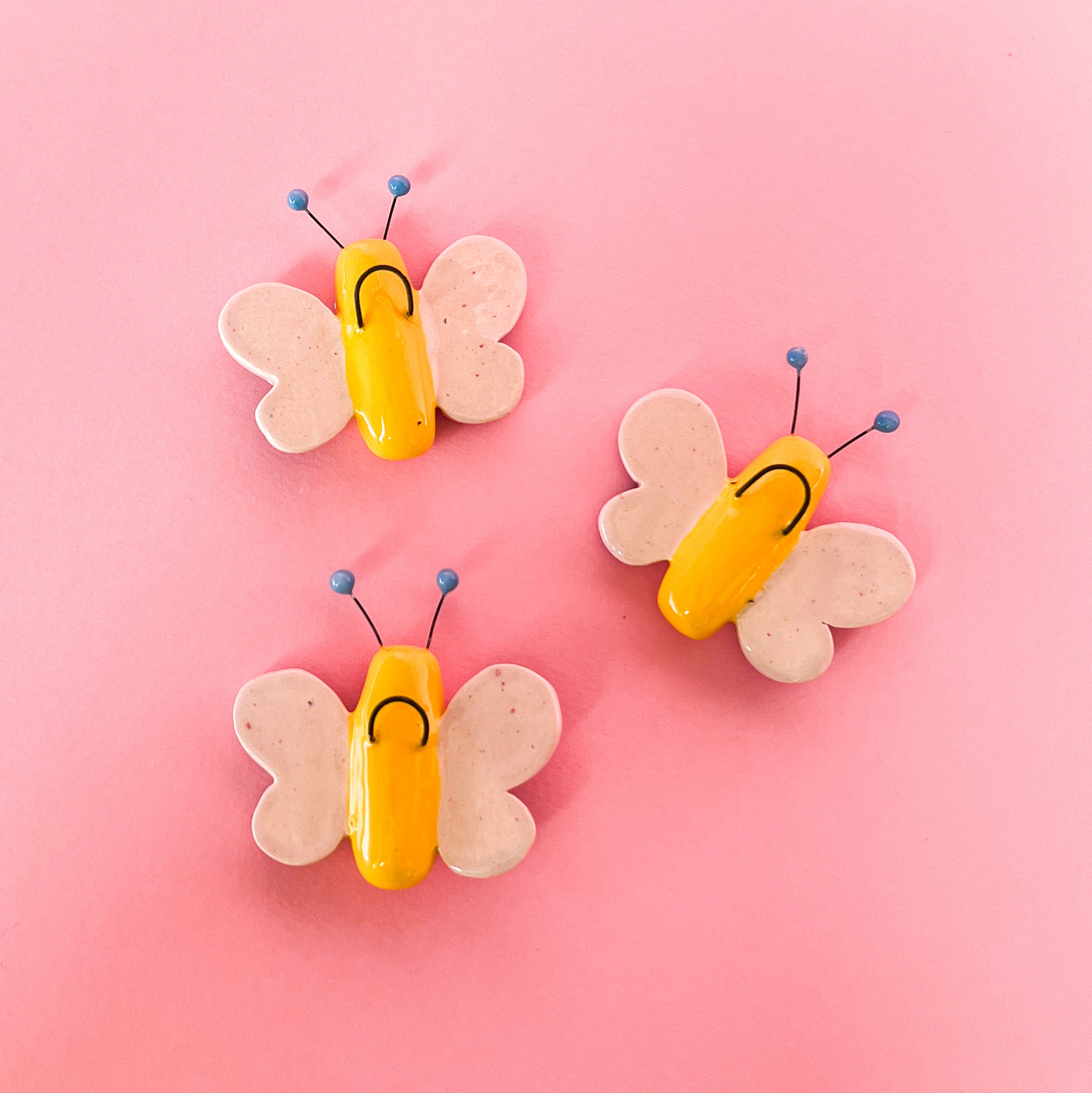 Due to the nature of the multi-colour underglaze I used, these butterflies may have small stilt marks on their backs from their glaze firing. (These are necessary to stop this specific underglaze running off the wings and dripping all over the kiln!) These marks are only on the back of the piece and do not impact the design, functionality or look of the butterfly at all!